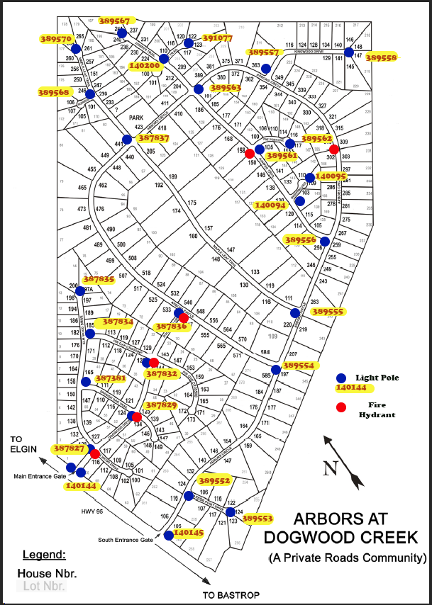 The map below shows the fire hydrants and light pole numbers. You can use the light pole numbers to report lamps that are not working to this site. Type the pole number into the field labeled "closest pole".